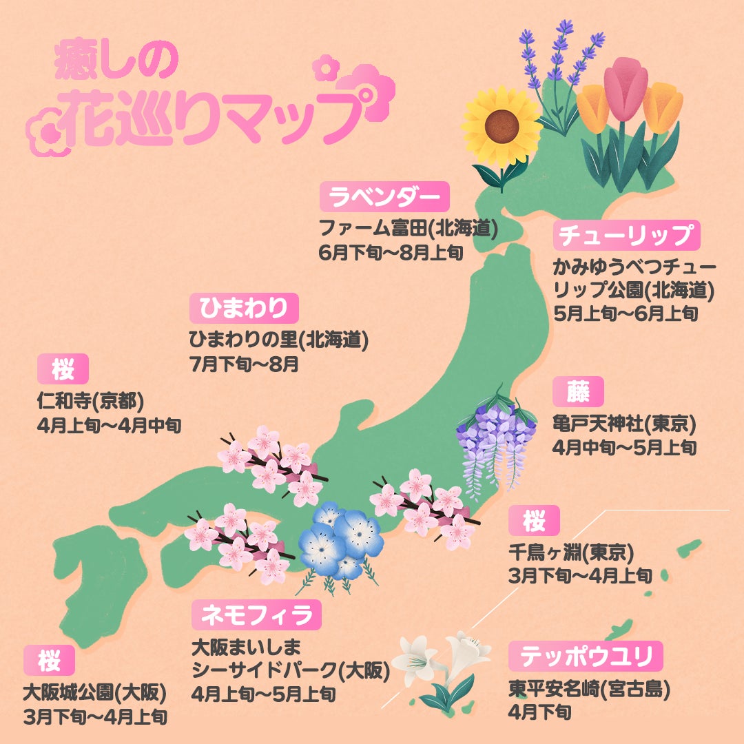 そこで、エクスペディアと Hotels.com は、この春、花見旅行を楽しみにしている人、迷っている人に向けた、全国の花見情報が一目でわかる『花見マップ』を作成しました。旅行者が安心して旅ができるよう、お得なパッケージプランやホテルプランをご紹介します。