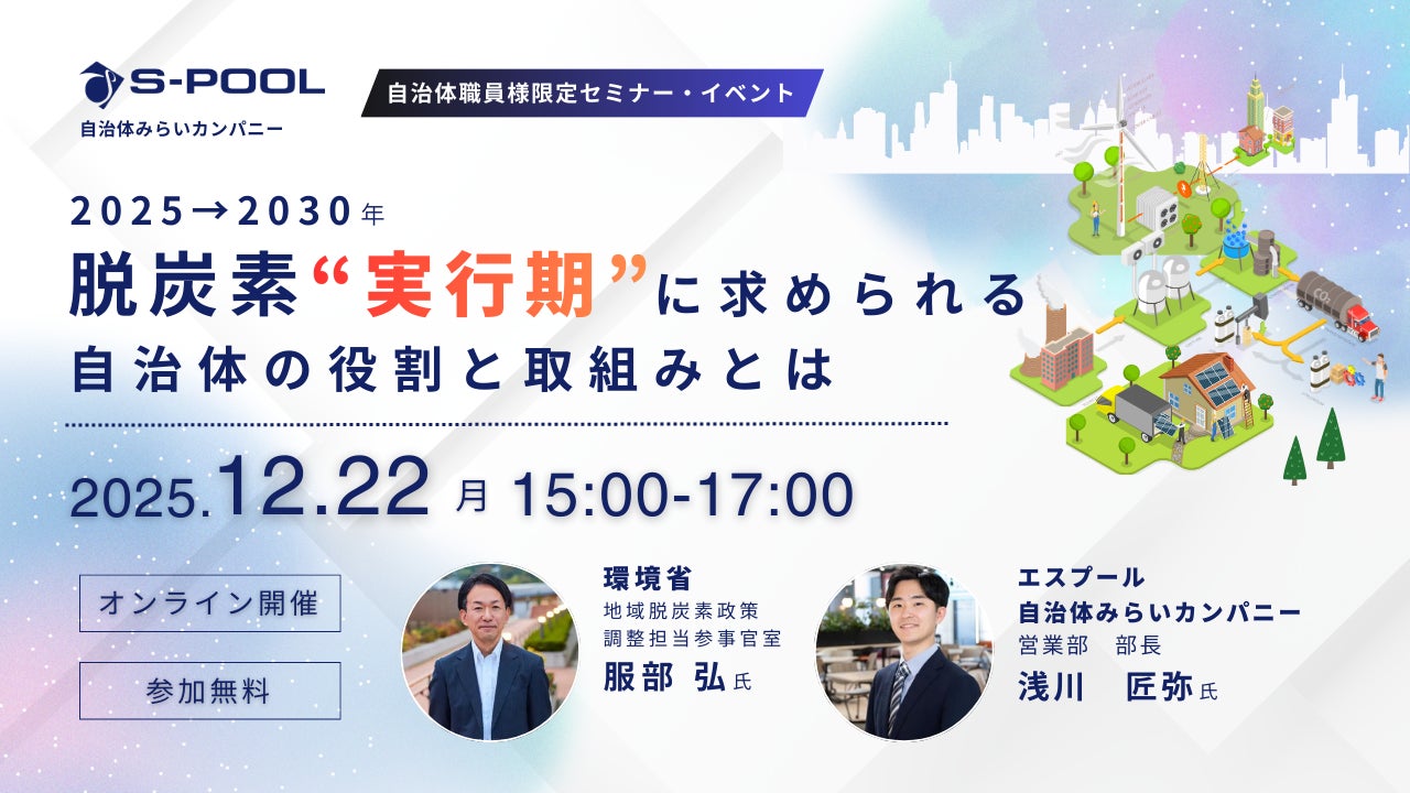 株式会社エスプール(本社:東京都千代田区、代表者:浦上 壮平)は、2025年12月22日(火)15:00より、無料オンラインセミナー「2025-2030 脱炭素”実行期”の自治体の役割と取組み」 を開催します。2030年脱炭素社会の実現に向けて、2025年からの5年間は“計画から実行へ”と大きく舵を切る重要な期間となります。本セミナーでは、この実行期に自治体に求められる役割や、取り組みを推進するうえで押さえるべき最新情報をお届けします。