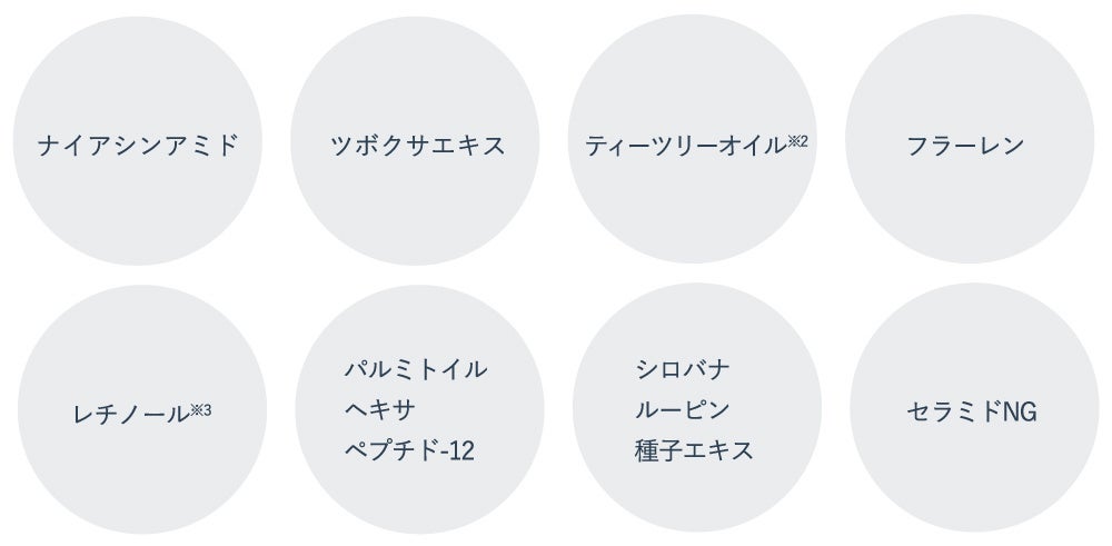※1 メイクアップ効果による ※2 ティーツリー葉油 ※3 パルミチン酸レチノール