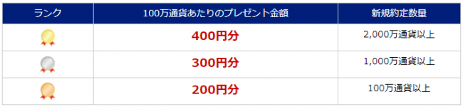 上記の各対象期間中における対象通貨ペアのお取引数量の合計が100万通貨以上に達したお客さまに対して、下表のとおり新規約定数量に応じた3種類のランクを適用しAmazonギフト券(Eメールでお届け)をプレゼントさせていただきます。