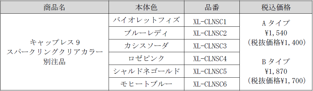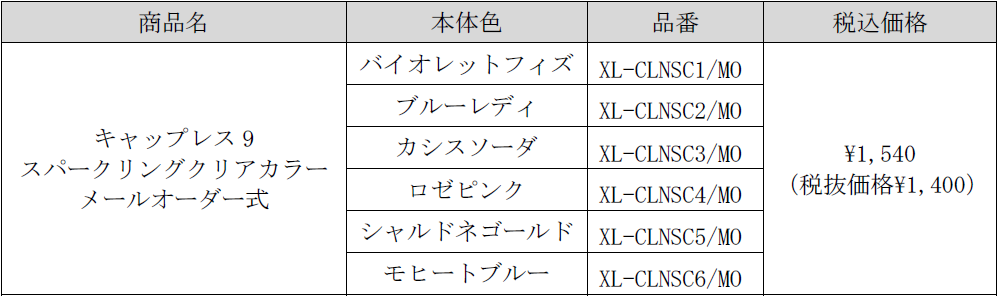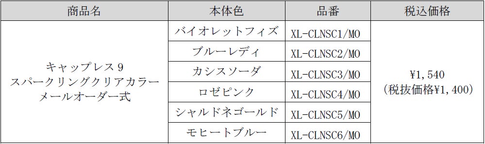 この度発売する「キャップレス9 スパークリングクリアカラー」は、さわやかなカクテルトーンの本体色が特長です。カラーは、バイオレットフィズ、ブルーレディ、カシスソーダ、ロゼピンク、シャルドネゴールド、モヒートブルーの全6種類。