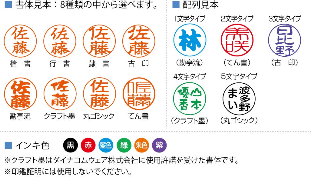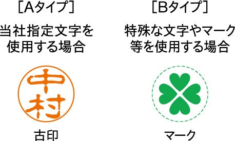 販売形態は、お好きな色の商品をご購入いただき、インターネットまたは同封の専用ハガキから申し込むことができるメールオーダー式と、印章店や文具店などで注文する別注品があります。別注品では、文字だけでなくロゴやマークも作成できます。