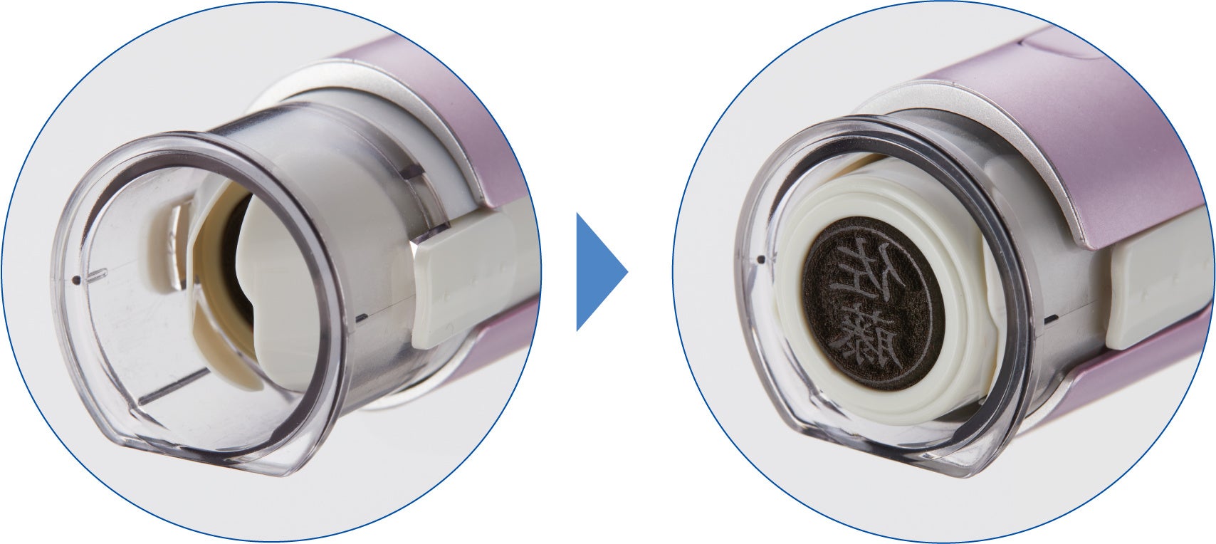 「キャップレス9」は、なつ印時にキャップが自動で開くワンタッチ式のネーム印です。朱肉のいらないインキ内蔵のネーム印とウィングシャッター機構により、キャップを外す手間なく、片手でスマートになつ印ができます。また、シャッターの透明部分の端面にフラットな形状を設けることで、なつ印枠の下線と平行にすることができ、真っ直ぐきれいになつ印ができます。