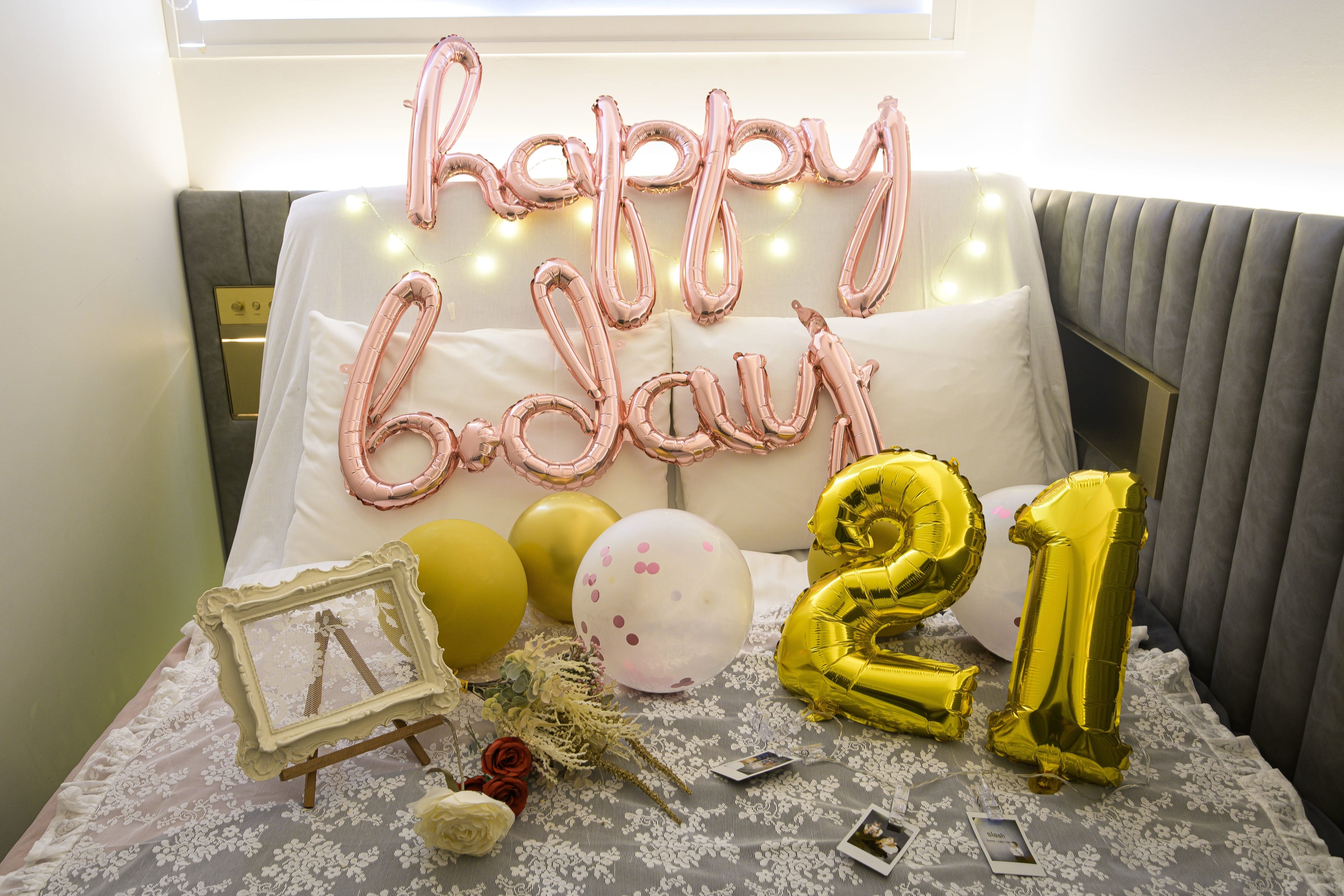 Happy Birthday風船(ピンクまたはゴールドから選択)、丸いストリングライト 、レースのベッドスロー 、レースの額縁 、クリップライト 、ミニブーケ(造花) 、バルーン2個(ピンクのラメ入り)