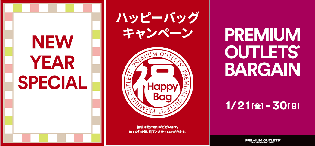 全国9カ所のプレミアム・アウトレットにて、お得なハッピーバッグ(福袋)を販売する「ハッピーバッグキャンペーン」、人気ブランドが参加する初売りセール「ニューイヤースペシャル」を開催します。