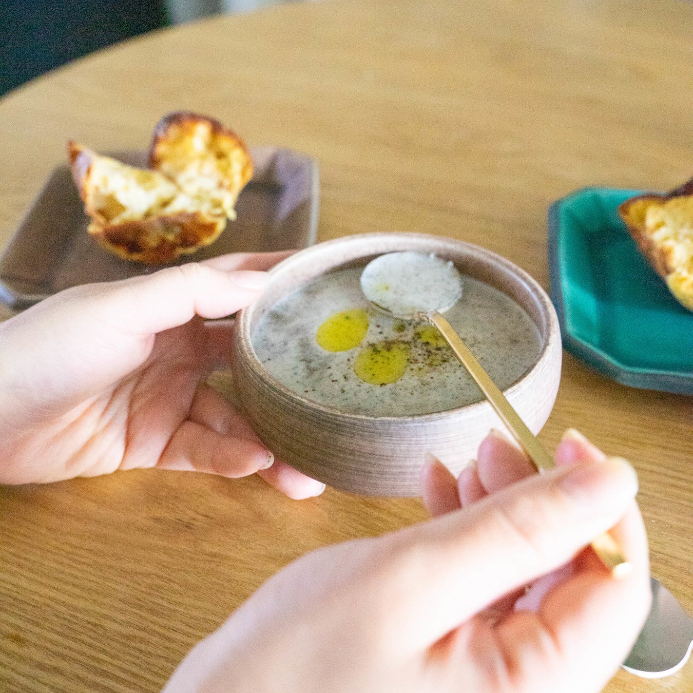 「栗茶」は、マットなブラウンなので和風すぎずモダンな印象に。別注アイテムの深鉢は、これまでの平鉢と違い口に向かって内側にカーブを描いているので、掬いやすいし持ちやすい器です。小鉢としてはもちろん、スープ皿やとろみのあるおかずにぴったりのアイテムです。深鉢は横から眺めた際の刷毛目が美しく、落ち着きと上品さを兼ね備えています。