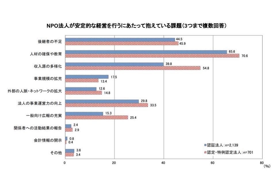 内閣府の調査によると、NPO法人が安定的な経営を行うにあたって抱えている課題として約66%の認証法人が「人材の確保や教育」をトップに挙げています。この傾向は、この10年間変わっていません。