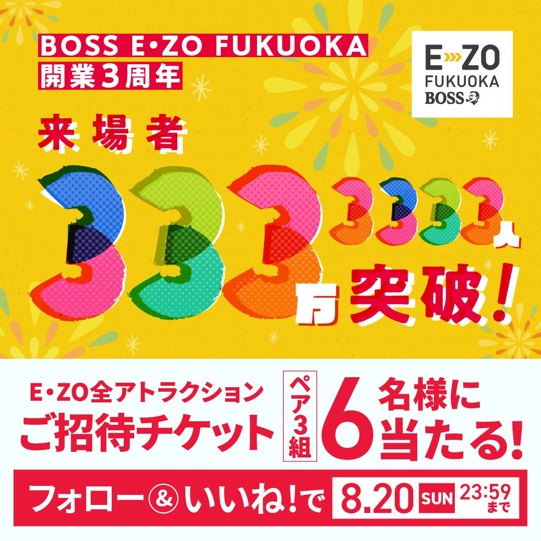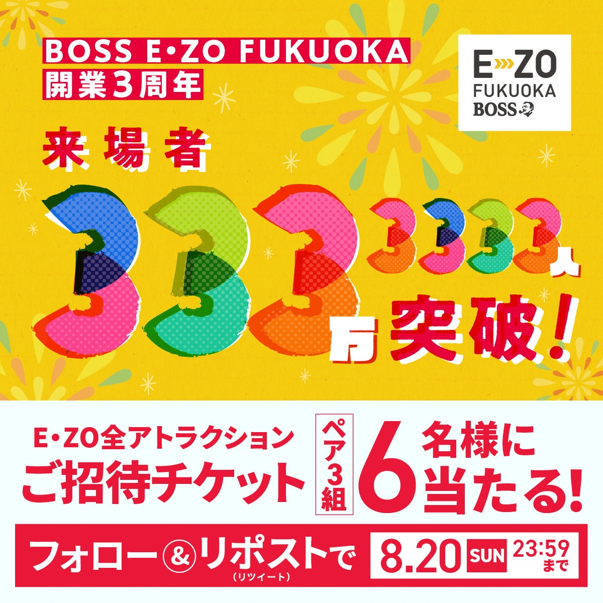 2020年7月に開業し先日3周年を迎えたばかりの「BOSS E・ZO FUKUOKA」の累計来場者数が、8月7日(月)に333万3333人を突破しました!