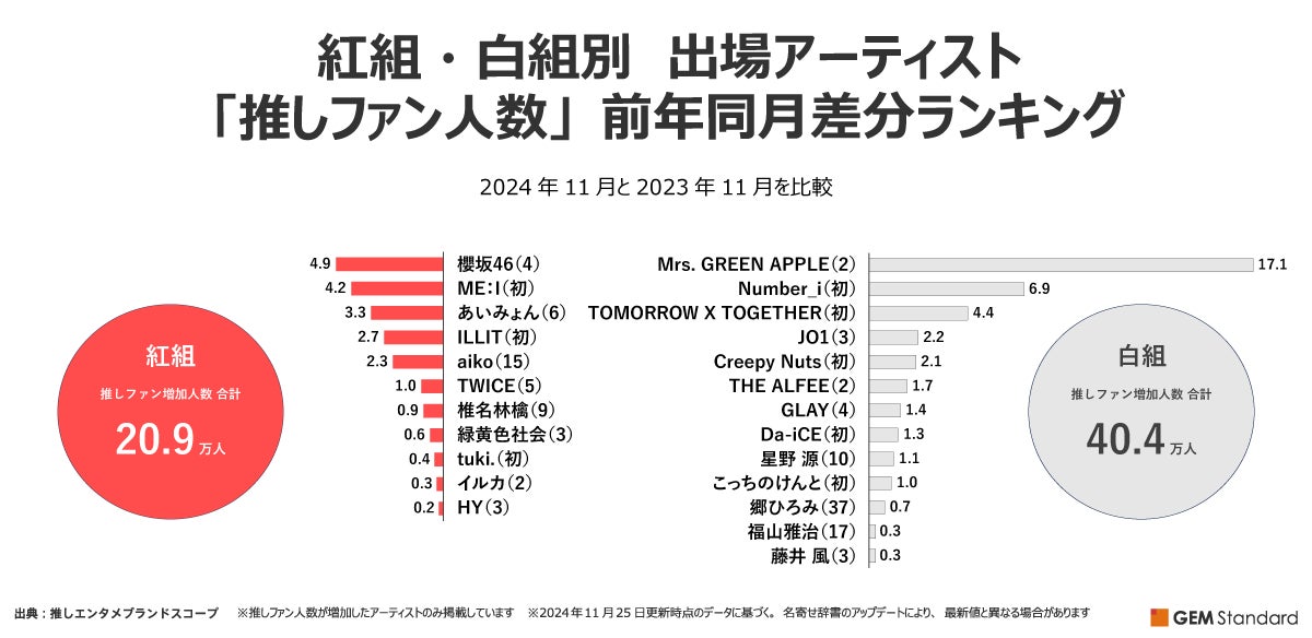 次に出場アーティストを推しているファンの人数=「推しファン人数」について、今年11月と前年同月の推しファン人数の差分を比較し、よりファン層を広げているのが紅組・白組のどちらなのかをみてみます。直近1年間でより推しファン人数を多く獲得しているアーティストは、人気と勢いがあり、ファンの熱量も高まりやすい状態にあると言えます。以下は前年から推しファン人数を増やしているアーティストと、増加人数のランキングです。