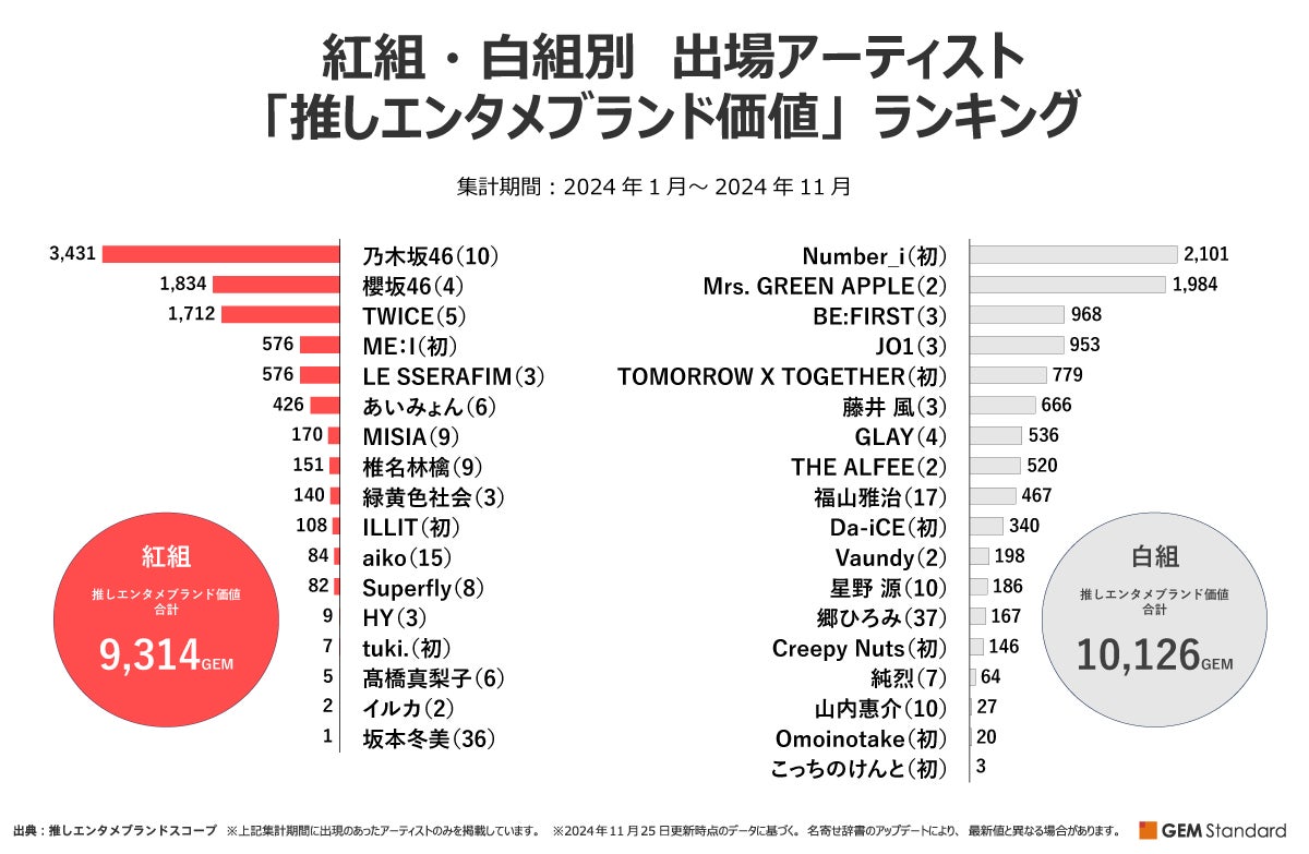 下記は「推しエンタメブランドスコープ」の2024年1月~11月までのデータをもとに、出場アーティストの「推しエンタメブランド価値※」を紅組・白組に分けて順位付けしたものです。
