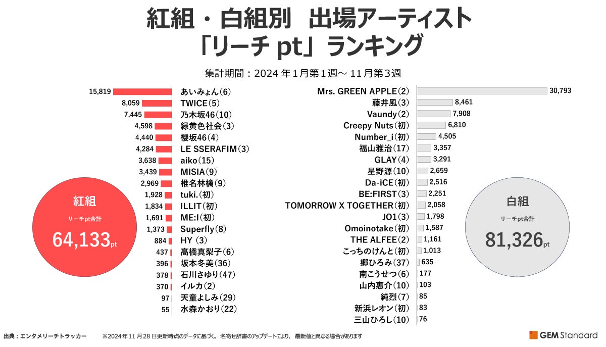 最後に、エンタテイメントの真のリーチをメディア・サービス横断で把握するサービス「エンタメリーチトラッカー」をもちいて、出場アーティストのリーチ力を比較しました。データの単位は「リーチpt」で、エンタメブランド(音楽メディアではアーティスト)に接触した延べ人数を日次調査し週単位で集計しており、どのエンタメブランドにどの程度の人が接触しているのかを可視化しています。下の図は、2024年1月第1週から11月第3週までのデータをもとに、出場アーティストのリーチptを紅組・白組別に順位付けしたものです。