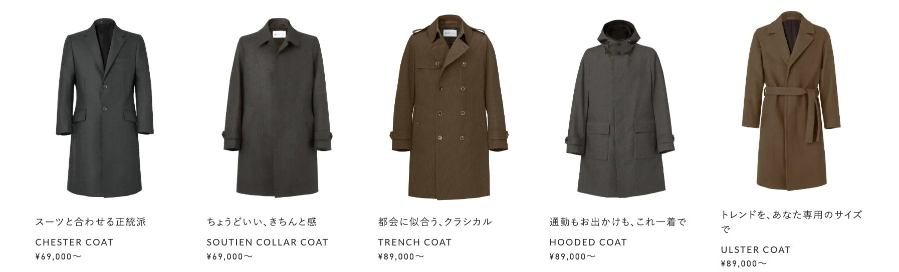 チェスター、ステンカラー、アルスター、フーデッド、トレンチの計5型のオーダーコートが69,000円(税込)から。