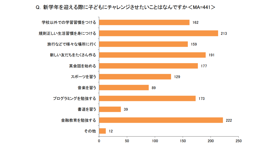 また、「新学年を迎える際に子どもにチャレンジさせたいことはなんですか<MA>」と聞いたところ、「金融教育を勉強する」(222)が半数以上で最も多く、続いて2位「規則正しい生活習慣を身につける」(213)、3位「新しい友だちをたくさん作る」(191)となりました。