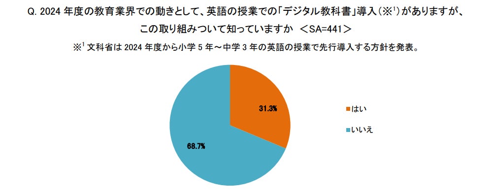 「2024年度の教育業界での動きとして、英語の授業での「デジタル教科書」導入(※1)がありますが、この取り組みついて知っていますか<SA>」の問について、「いいえ」(303)が約7割となり、多くの親がデジタル教科書の導入について知らないことがわかりました。