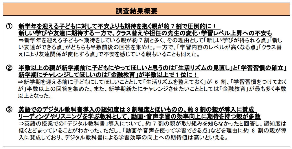 調査の結果、新学年を迎える子どもに対し期待する親が約7割と、不安を抱く親よりも圧倒的に多い結果となりました。また、新学期を迎える前に子どもにしてほしいこととして「生活リズムの見直し」と「学習習慣の確立」との回答が集まり、新学期にチャレンジしてほしいことの上位には「金融教育」があがりました。さらに、2024年度から英語授業でのデジタル教科書導入が始まることについて、認知度は3割程度と低いものの、約8割の親が導入に賛成していることがわかりました。