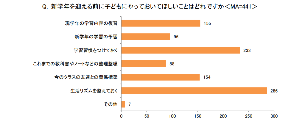 「新学年を迎える前に子どもにやっておいてほしいことはどれですか<MA>」の問では、「生活リズムを整えておく」(286)が6割以上で最も多く、「学習習慣をつけておく」(233)が半数以上で続き、健康面と学習面での習慣づけが重要であると多くの親が考えていることがわかりました。