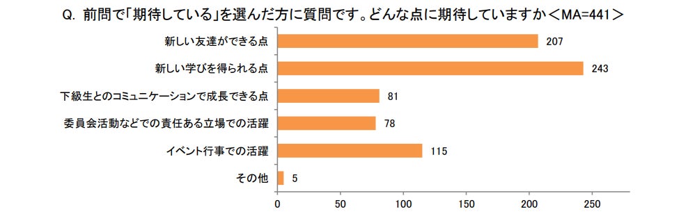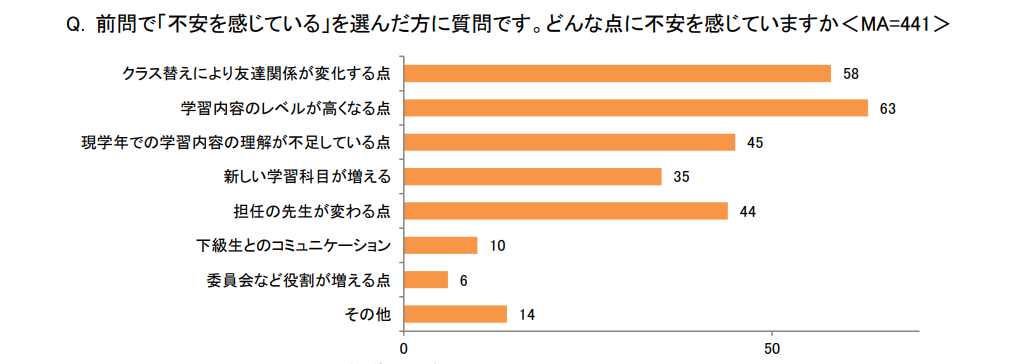 中でも、特に期待されている点としては「新しい学びを得られる点」(243)と「新しい友達ができる点」(207)があげられ、どちらも半数前後の回答を集めました。一方で、不安に感じている点としては、「学習内容のレベルが高くなる点」(63)と「クラス替えにより友達関係が変化する点」(58)が4割以上の回答で最も多くなり、この他に「現学年での学習内容の理解が不足している点」(45)、「担任の先生が変わる点」(44)にも回答が集まりました。