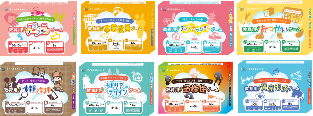 『子ども未来キャリア(新教材)』は、『子ども未来キャリア』をより授業で扱いやすいようにブラッシュアップしパッケージ化した新教材です。従来の『子ども未来キャリア』の特性を引き継ぎ、ボードゲームを通じた疑似体験と、スライド教材を活用した学習を組み合わせた「遊び×学び」を融合した内容で、主体的に楽しく学ぶことができます。