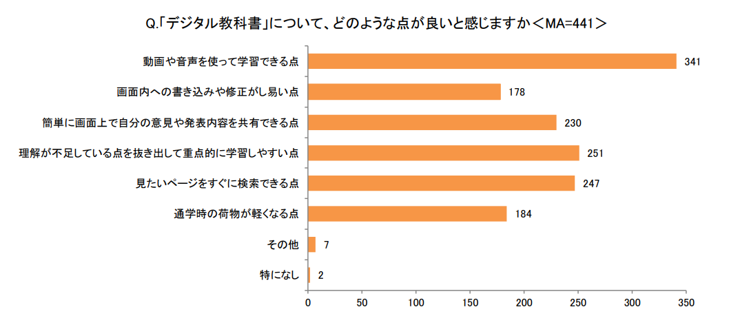 他にも、半数以上の親が「理解が不足している点を抜き出して重点的に学習しやすい点」(251)、「見たいページをすぐに検索できる点」(247)、「簡単に画面上で自分の意見や発表内容を共有できる点」(230)と回答しており、デジタル教科書による学習効率の向上にも期待値が高いことがわかりました。