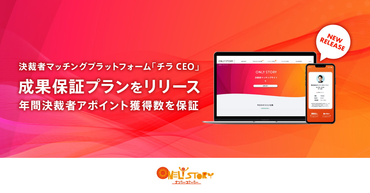 決裁者マッチング支援プラットフォーム「チラCEO」(https://onlystory.co.jp/ )を運営する株式会社オンリーストーリー(代表取締役:平野哲也、本社:東京都渋谷区)が、『成果保証プラン』を新規リリースすることをお知らせいたします。同プランは、決裁者との年間アポイント獲得数を保証する新規プランです。