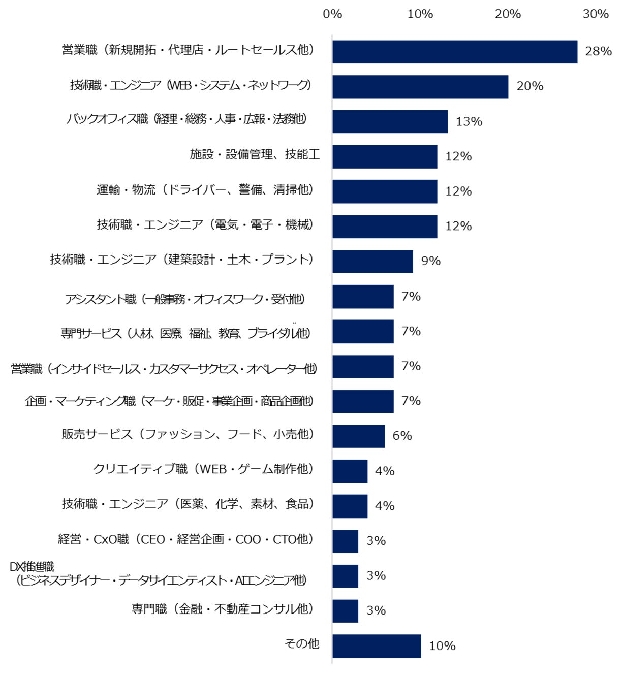 “現在、人材が不足している部門が「ある」と回答した企業に、不足している職種を伺いました。トップ2は「営業職(新規開拓・代理店・ルートセールス他)」(28%)、「技術職・エンジニア(WEB・システム・ネットワーク)」(20%)でした。”