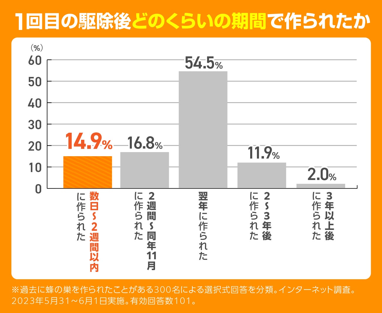 次に、同一物件の同じ場所に2回以上巣を作られた方に対し、1回目の駆除後どのくらいの期間で巣を作られたかを調査した結果が下図です。