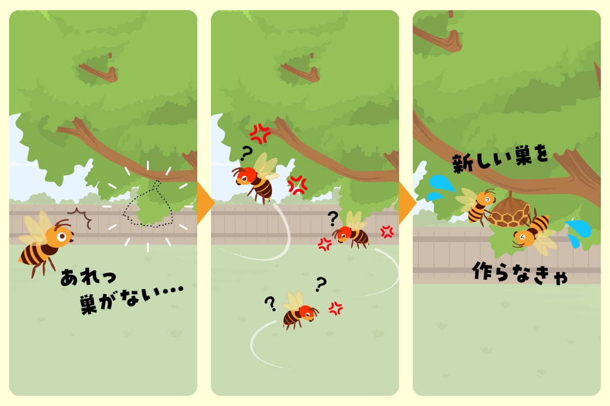戻り蜂は通常1~2週間程度でいなくなることが多いようですが、「帰ってきたら家がない!」となったら、我々人間でも混乱しますよね。蜂が興奮して攻撃的になっている可能性もあります。