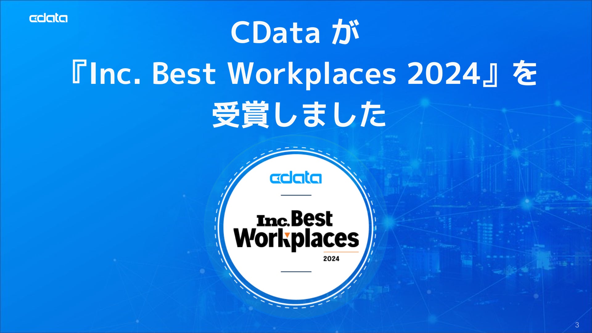 2024年6月21日、CData Software, inc.(本社:アメリカノースカロライナ州、日本オフィス:宮城県仙台市、代表社員 職務執行者:疋田 圭介、以下CData)は、 『Inc. Best Workplaces 2024』を受賞したことを発表します。社員皆が成長・活躍でき、チームワーク、イノベーションを促進する職場環境を形成する取り組みが評価されました。