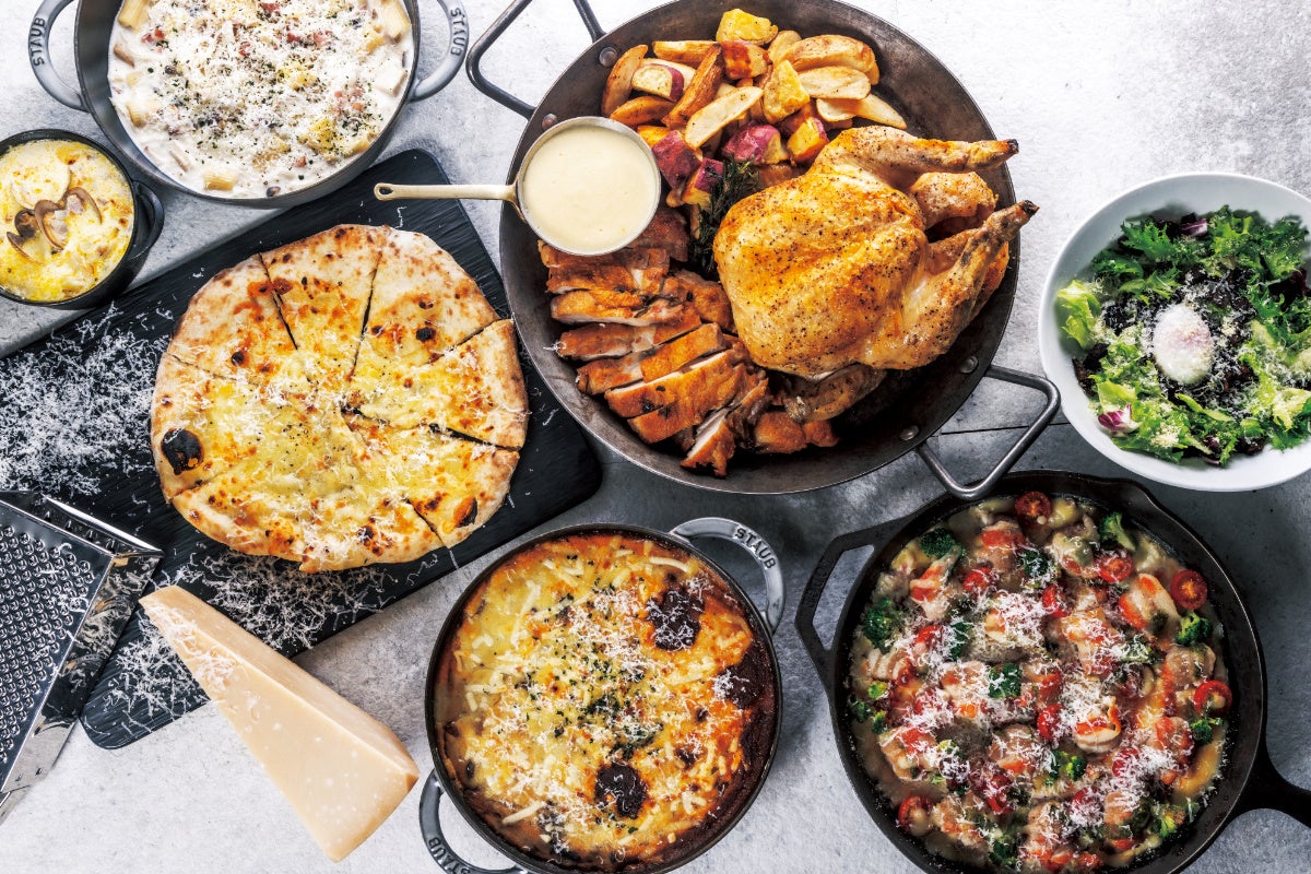 4種のチーズピッツァや茸とベーコンのホワイトソースパスタ、豚肉とトマトの焼きリゾットなど、チーズをふんだんに使った料理がディナービュッフェに登場します。ローストチキンにはパインテラス特製のチーズソースを絡めて。チーズ好きにはたまらない!濃厚でリッチな食の体験をお楽しみください。ご宿泊でないお客さまもご利用可能です。