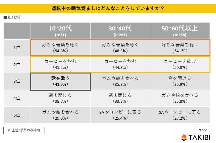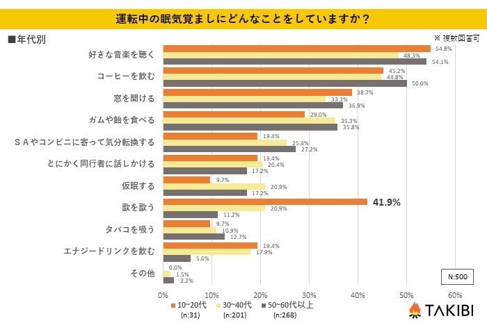 顕著に差が表れた項目として、「歌を歌う」が挙げられ、30~40代は約2割、50~60代以上は約1割に留まる中、10~20代では約4割が眠気覚まし対策として取り入れているということが分かりました。