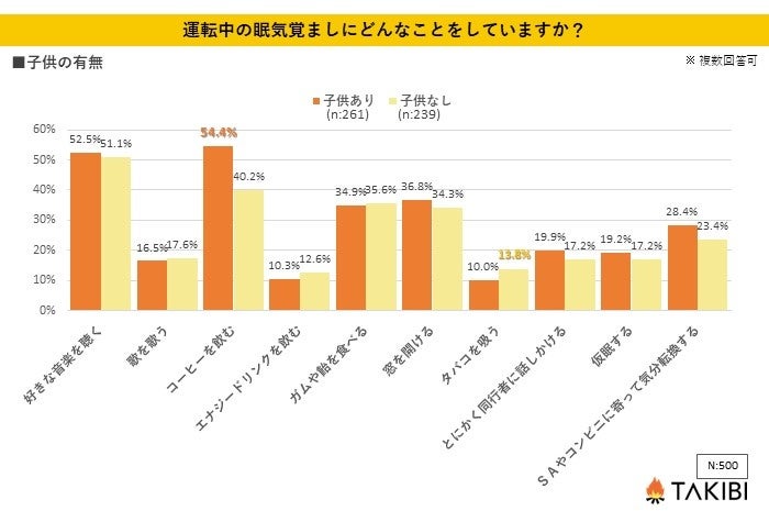 キャンプやグランピングを中心としたアウトドア総合情報サイト「TAKIBI」の運営をおこなう株式会社フォーイットは、全国の10代~60代までの男女500人を対象に運転中の眠気対策に関するアンケートを実施し、男女別・年代別等の特徴についてまとめました。