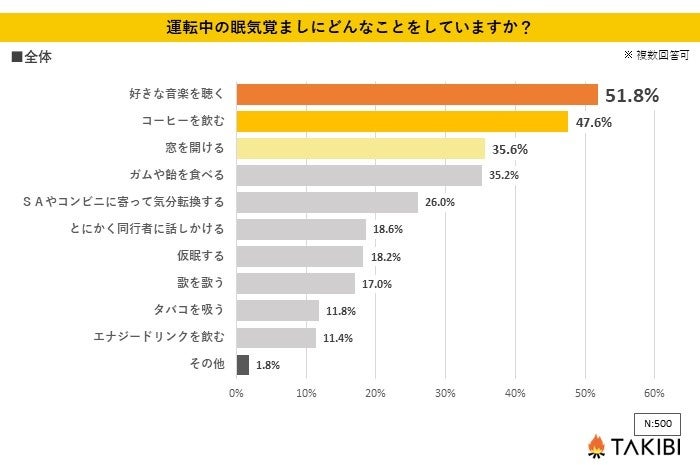 全国の10代~60代の男女を対象とした「運転中の眠気覚ましにどんなことをしていますか?」というアンケートを行ったところ、最も多かった回答は「好きな音楽を聴く」で51.8%という結果になりました。次いで、「コーヒーを飲む」が47.6%、「窓を開ける」が35.6%となっております。また、「その他」として「メンソール系の香りを嗅ぐ」という回答が得られています。