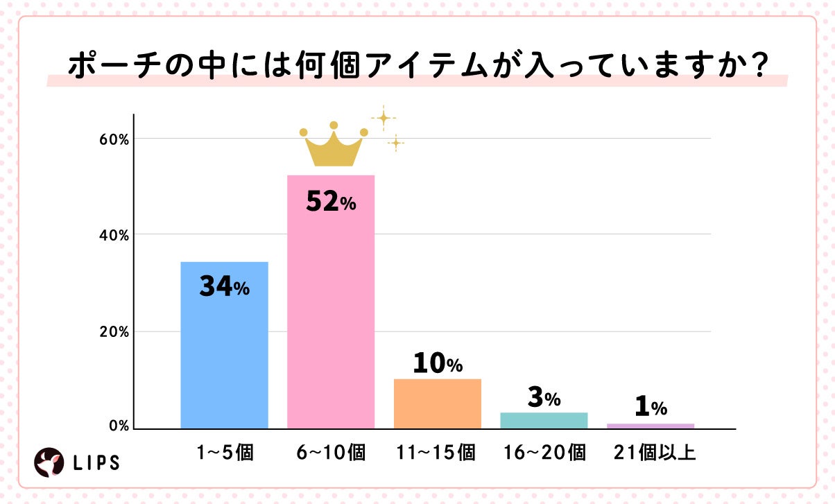 ポーチの中のアイテムの数は、全体で見ると「6~10個」と回答した人が52%と半数以上を占めました。どの年代でも約半数がこの個数を持ち歩いており、特に10代では57%と過半数を超えていたのが特徴です。