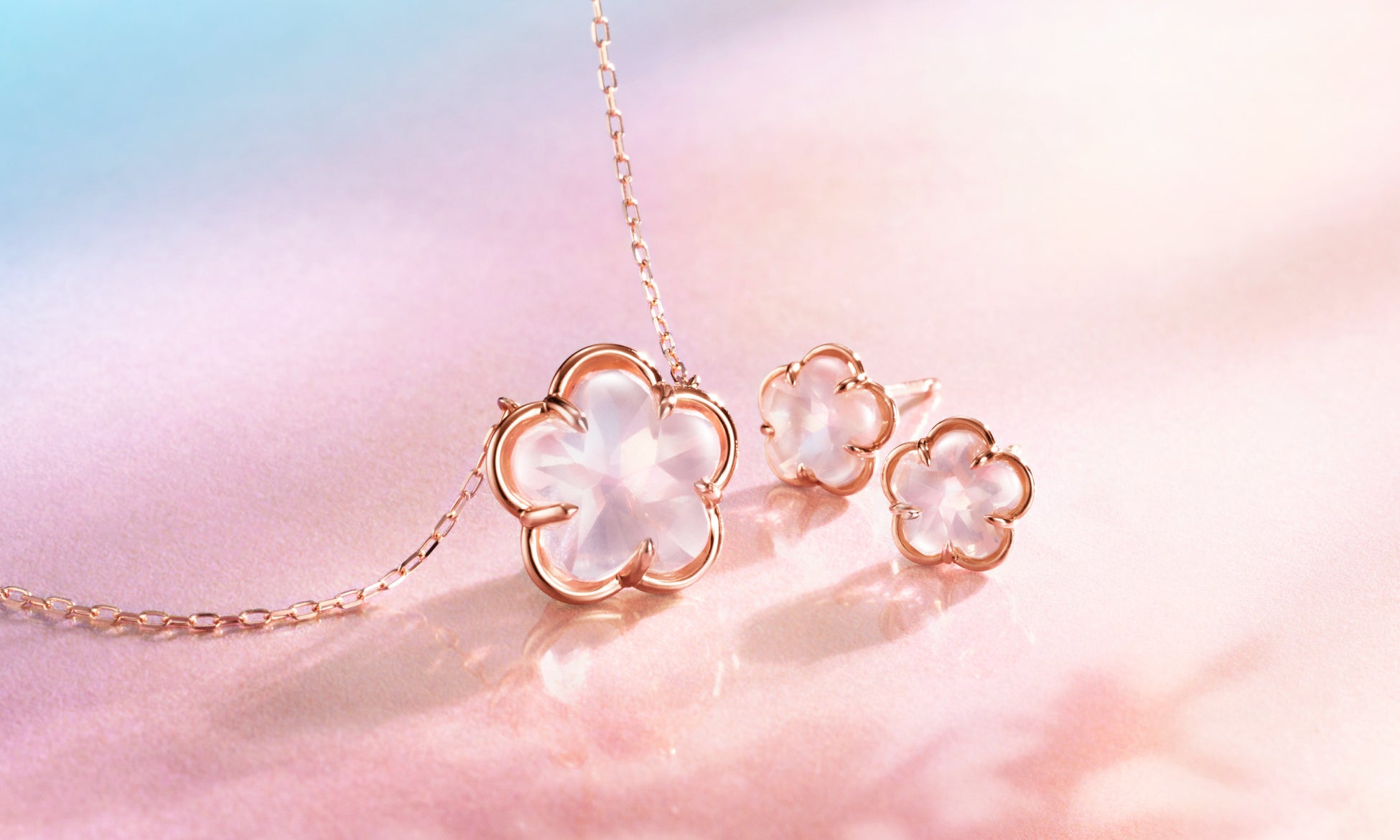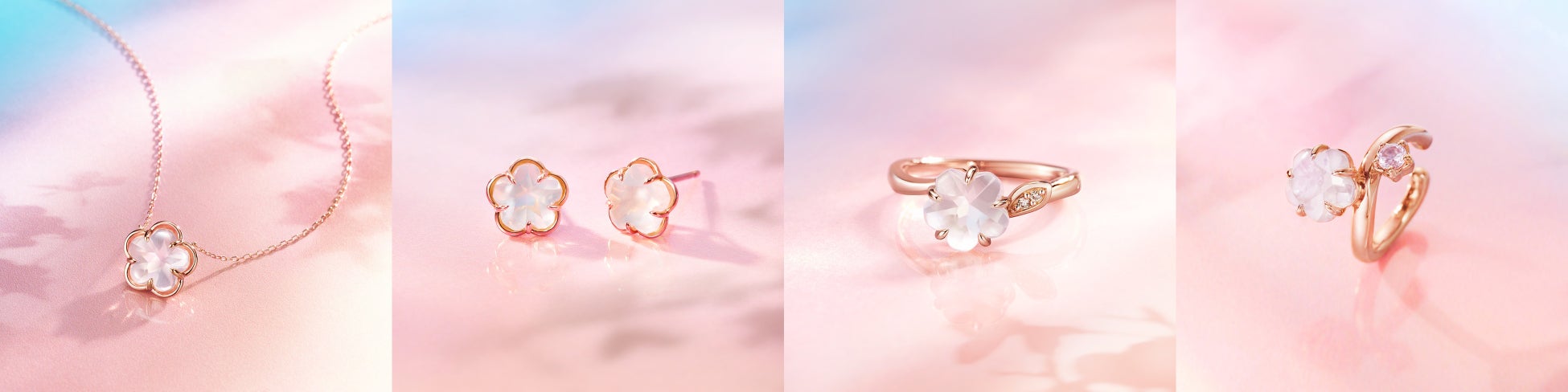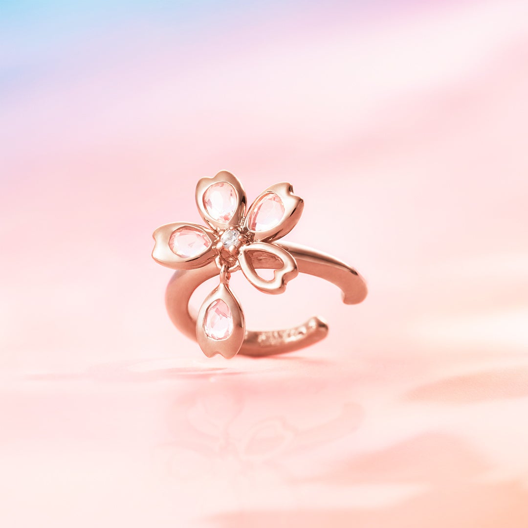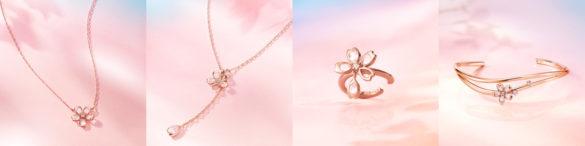 凛と咲く一輪の桜を描いたデザインでは、一枚一枚にあしらった淡いピンクのローズクォーツで、儚げで軽やかな花びらを表現。トップの取り外しが可能な3wayネックレスや、花びらが風に乗って揺れるイヤーカフ、初登場のバングルなど、コーディネートに新鮮な彩りを添えてくれるアイテムが揃います。