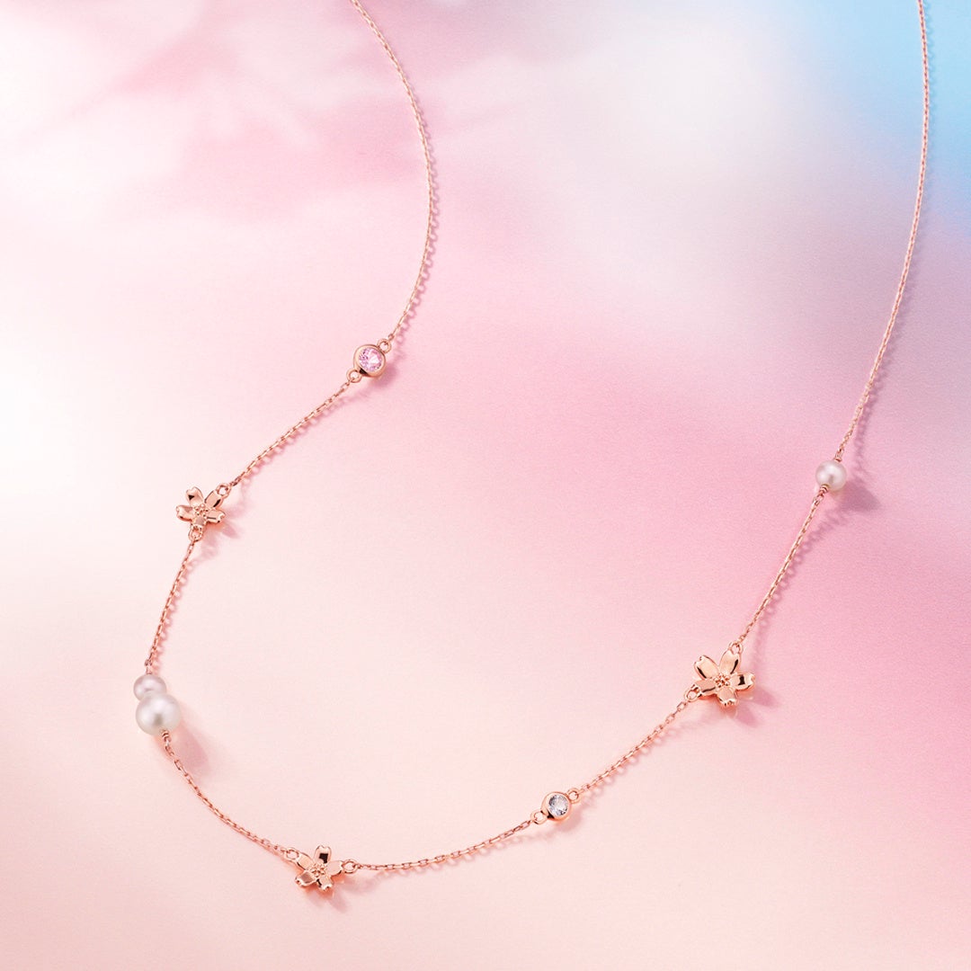 小さな桜たちが寄り添って咲く様子を描いた可憐なデザイン。ステーションネックレスはフリーアジャスター仕様でチョーカー風にも身に着けられ、重ね着けにも活躍してくれます。