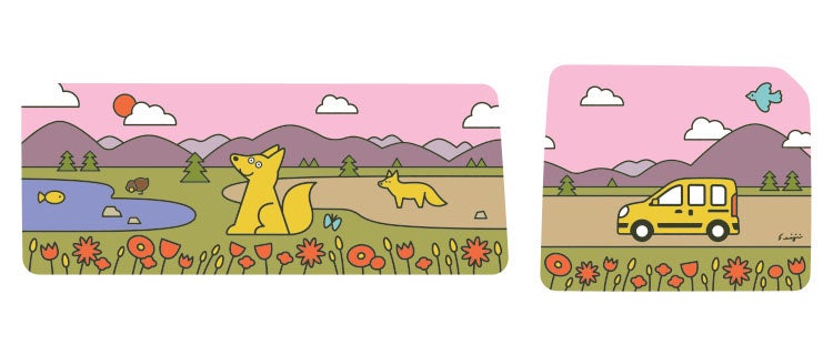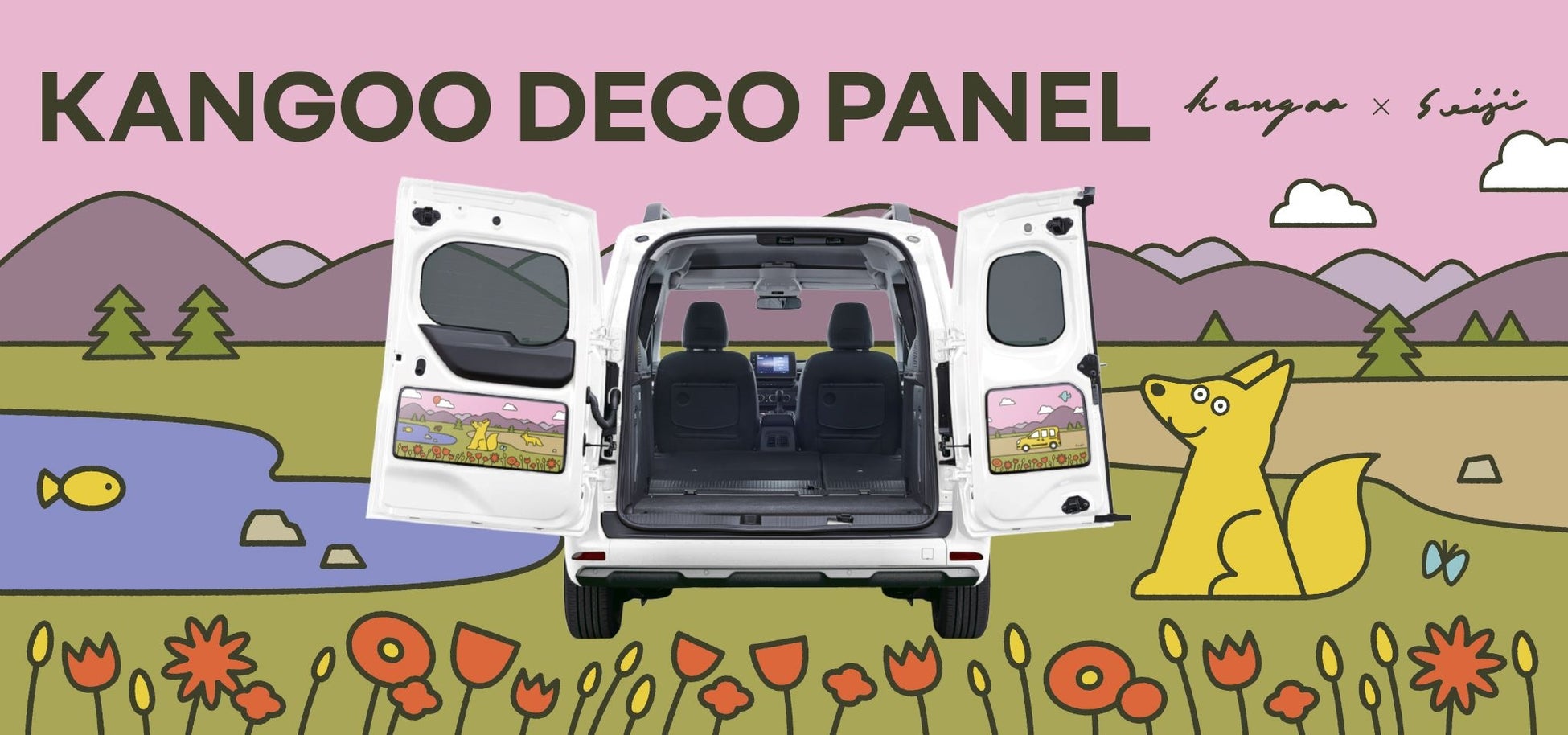 「カングー デコパネル」は、このルノー カングーの最大の特徴であるダブルバックドアのインナーパネルを楽しく個性的に彩る専用ステッカーで、10種類のデザインから好みのデザインを選べます。また、「カングー デコパネル」の発売を記念して、イラストレーターの松本セイジ氏が特別に描き下ろしたイラストのステッカーを、20セット限定で販売します。