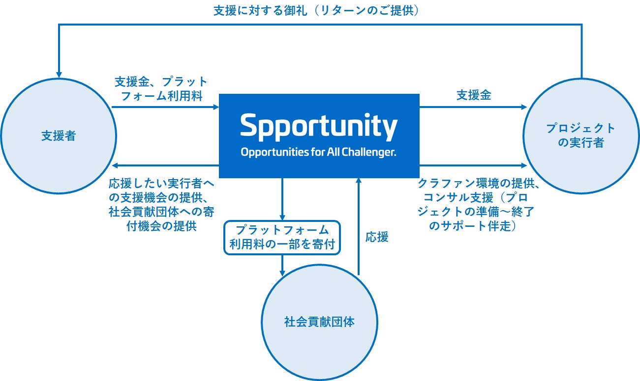 今回、こうした理念に一歩でも近づくため、クラウドファンディングのプロジェクトの支援時にプラットフォーム利用料をいただき、その一部を『スポチュニティ基金』として社会貢献活動を行う団体へ寄付する仕組みをスタートいたします。寄付をする社会貢献団体の皆さま、それを応援する関係者の皆さまにおかれましては、スポチュニティの理念や活動へ共感いただき、スポチュニティへ応援・ご協力いただいております。