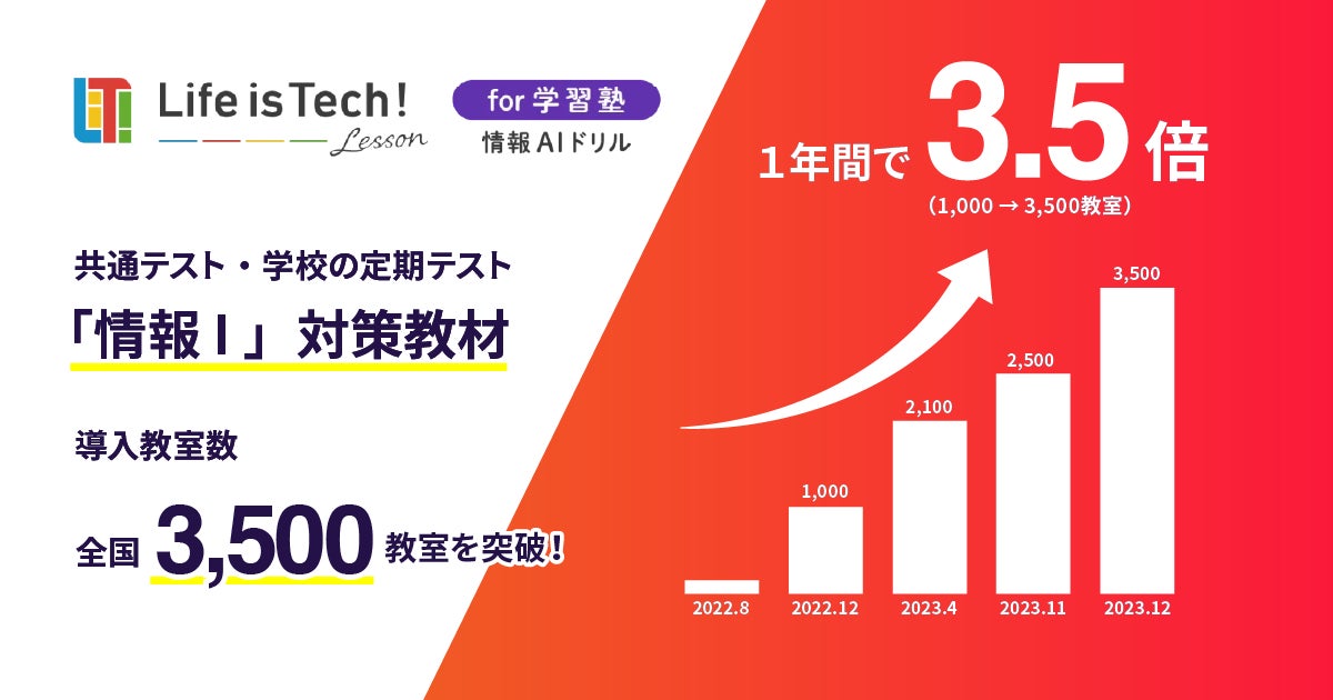 ライフイズテックの学習塾向け「情報 I 」対策教材「情報AIドリル」、導入教室数が全国3,500教室を突破!1年間で3.5倍に急拡大