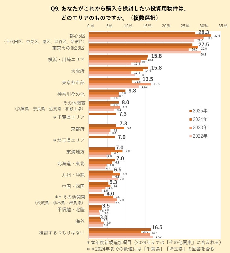 投資用不動産所有者に、購入を検討したい投資用物件のエリアを尋ねた結果、「東京都心5区(千代田区、中央区、港区、渋谷区、新宿区)」(28.3%)が3年連続でトップでした。ただし比率は前年比-4.2㌽で初の減少となり、同じく前年比減の「東京その他23区」(27.5%)との差は1㌽を切っています。