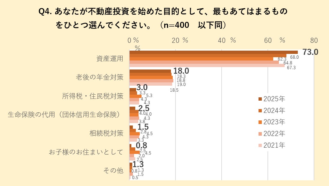 投資用不動産所有者に、不動産投資を始めた目的(最もあてはまるもの)を尋ねました。その結果、これまでと同じく「資産運用」(73%)が最多で、初めて7割を超えています。他の全項目が前年比で減少する中、+5㌽と唯一増加しました。