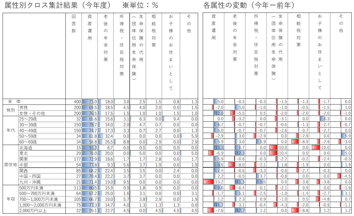 次点も昨年と同様「老後の年金対策」(18%)ですが、前回3位の「生命保険の代用(団体信用生命保険)」(2.5%)は前年比-1.5㌽で、「所得税・住民税対策」(3.0%)と順位が入れ替わり4位となっています。