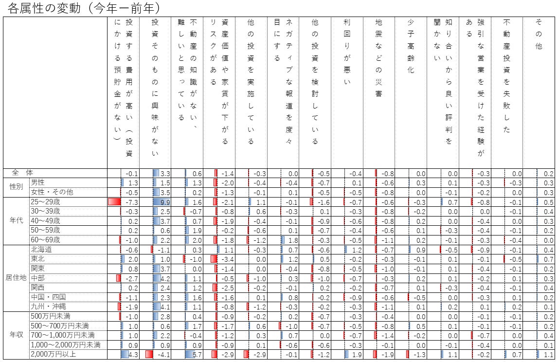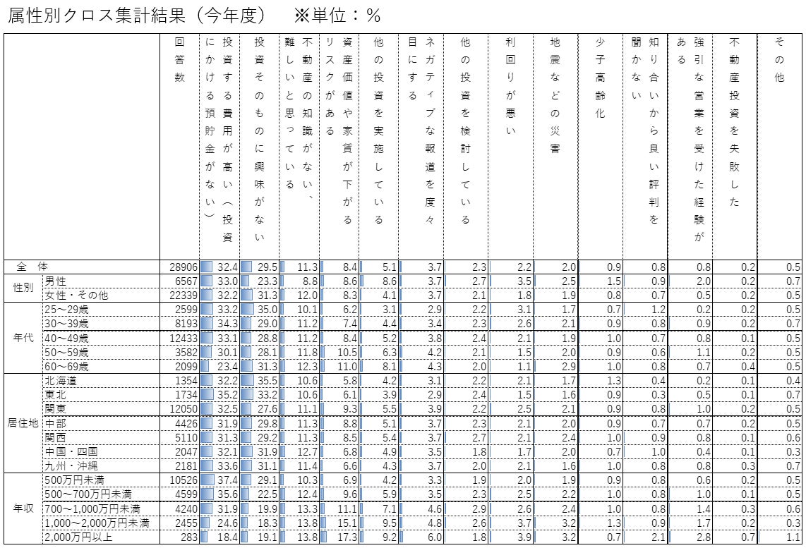 属性別にみると、年代別には概ねどの世代も「投資する費用が高い」「投資そのものに興味がない」の比率が高く、全体と似た傾向でした。しかし年収別には、概ね年収が高い層ほど「投資する費用が高い」の割合が低く、かつ「資産価値や家賃が下がるリスクがある」「他の投資を実施している」の割合が高くなる傾向がみられます。高所得者層は、不動産投資の費用の高騰自体はある程度許容できる一方で、株式など他の投資を実際に行いながらそれぞれのリスクを評価・比較した結果、不動産投資に慎重になっているものと考えられるでしょう。