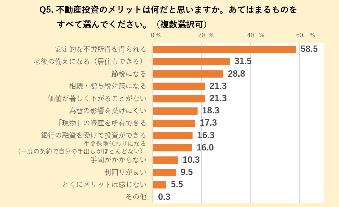 さらに「老後の備えになる(居住もできる)」「節税になる」が3割前後で次ぎ、老後の備えと税金対策としての有用性に対する評価は「投資目的」の調査結果を反映するものといえそうです。