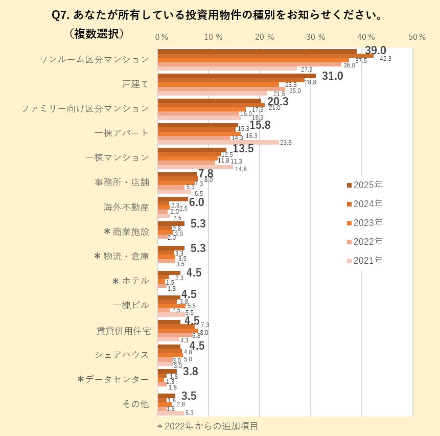 投資用不動産所有者に所有している物件の種別を尋ねました。「ワンルーム区分マンション」(39%)が5年連続でトップとなるも、比率は