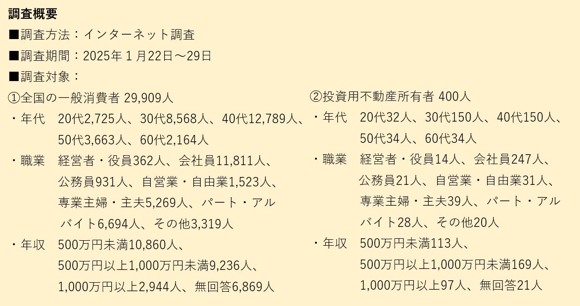 グローバル都市不動産研究所(以下、「当研究所」)では、全国の20~60代約3万人を対象に、投資や不動産投資に対する興味・関心を尋ねる内容と、投資用不動産所有者400人に対して投資目的・投資意向を尋ねる調査を実施しました。