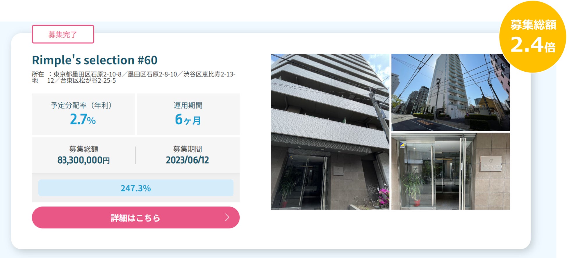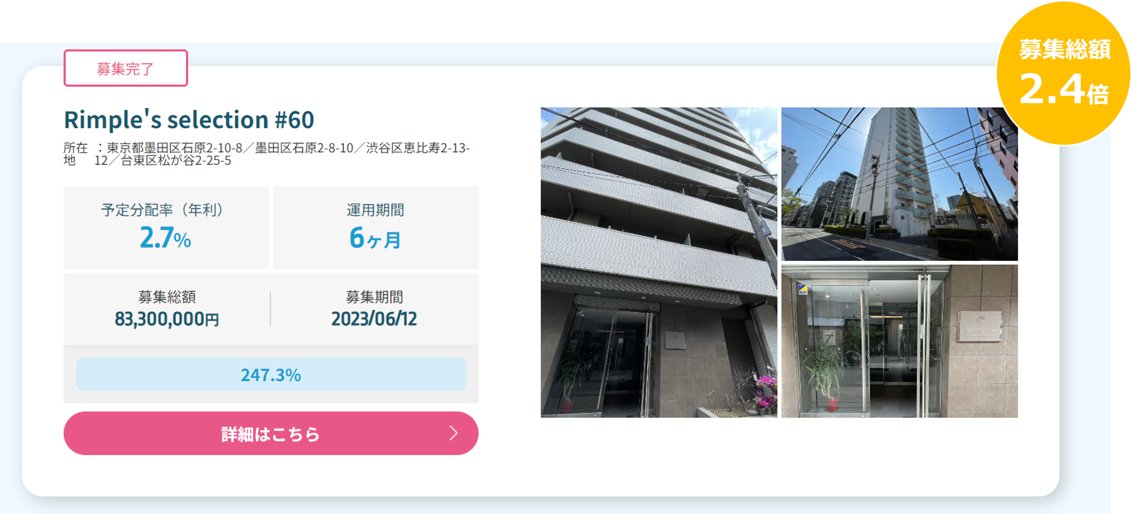 Rimple’s Selection#60 募集総額247.3%の2.06億円の応募