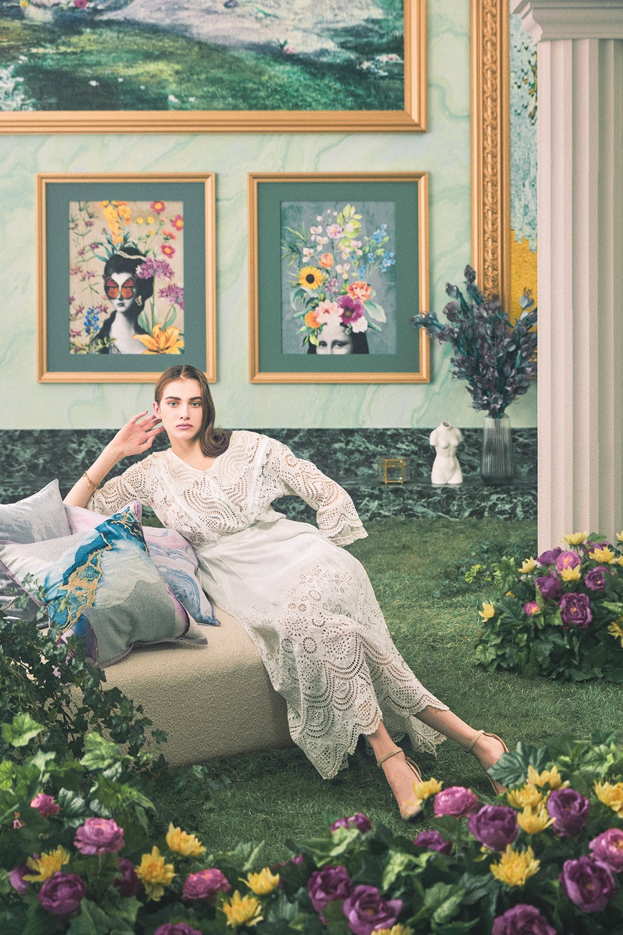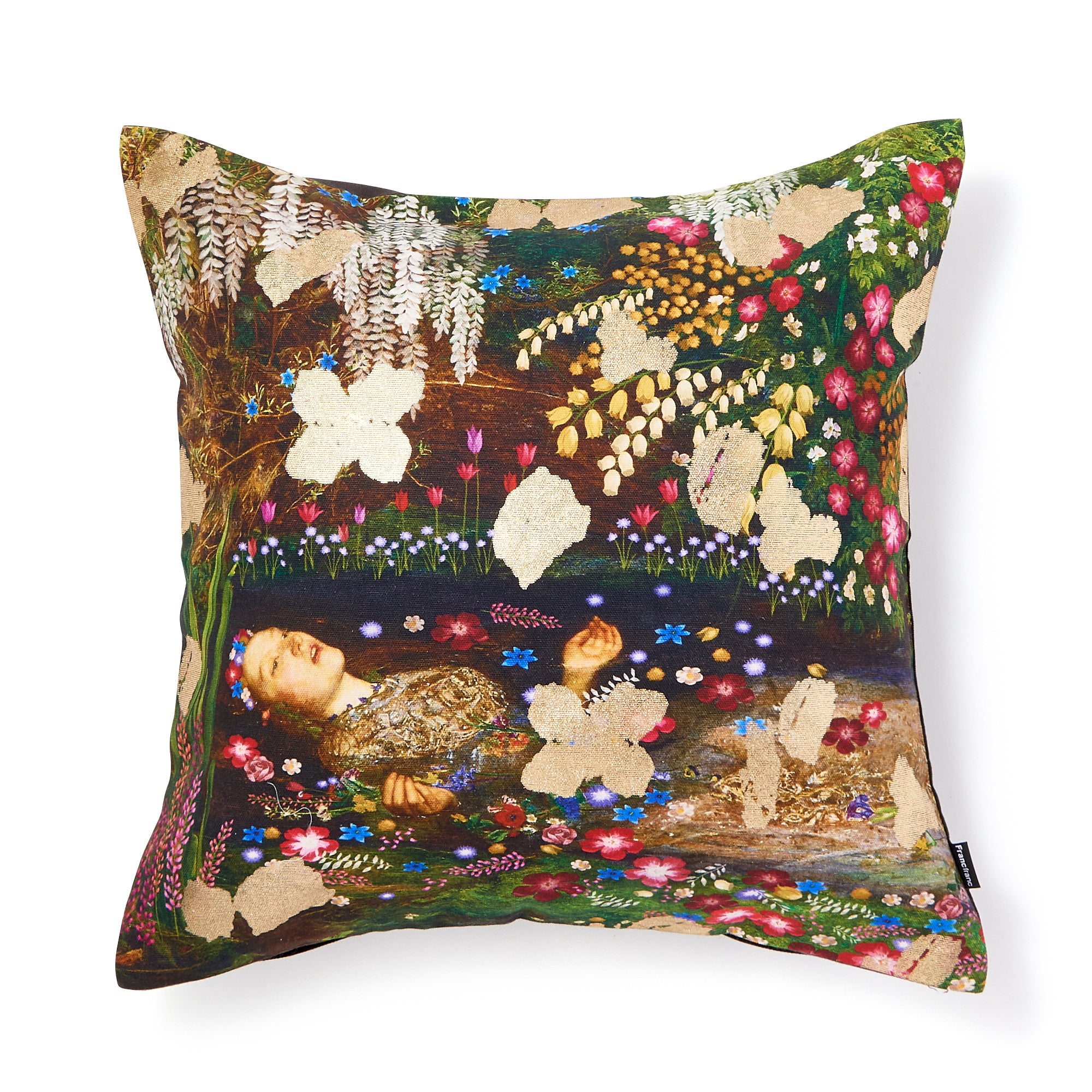 ミレーの絵画「オフィーリア」をモチーフにカラフルな花々のプリントとメタリックプリントを施した華やかなデザインです。