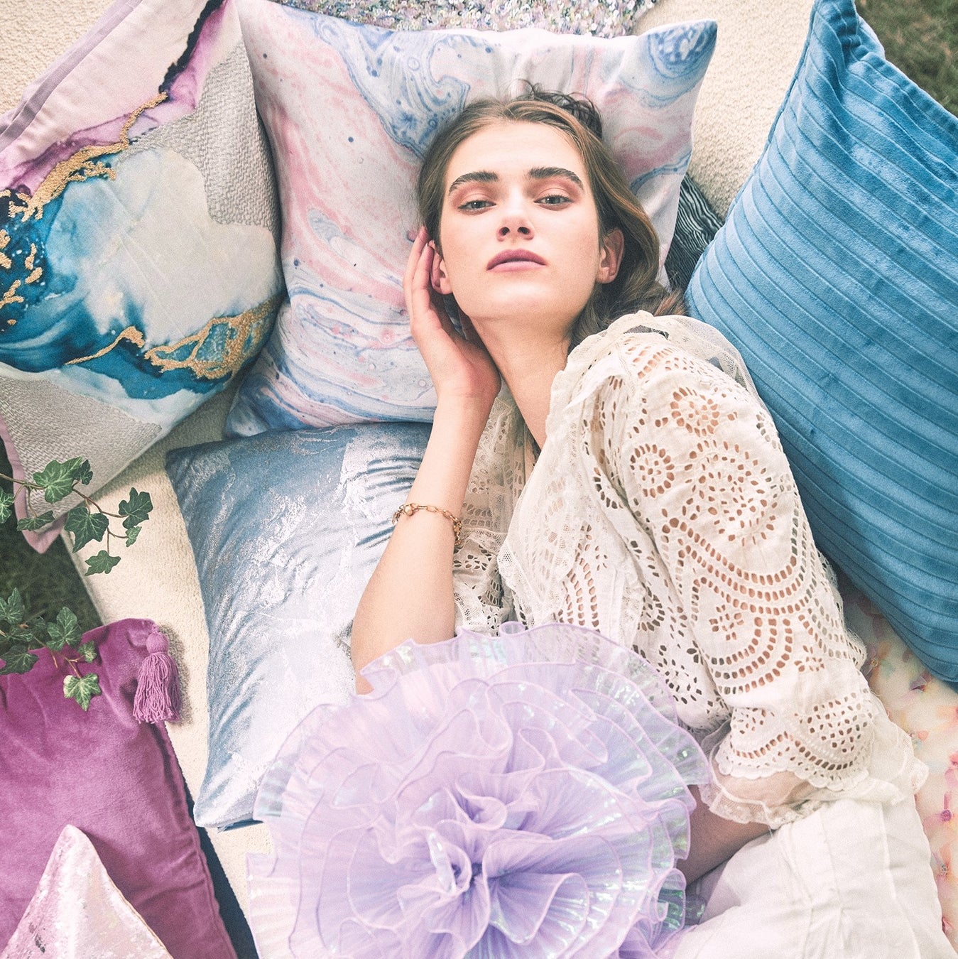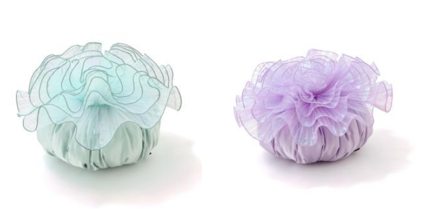 イソギンチャクをイメージした、ボリューム感のあるインテリアクッションです。 オーロラのようなキラキラとしたフリル生地の華やかなデザインが特徴で、春夏の明るいインテリアシーンのポイントになります。