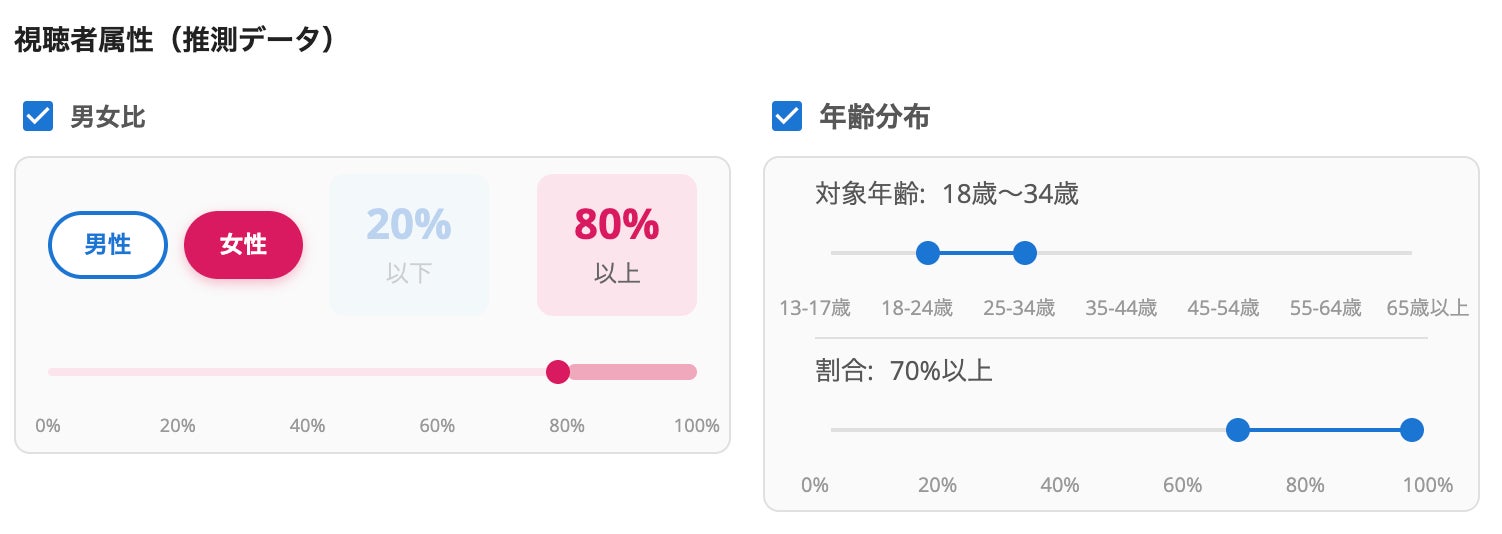 例えば、「女性比率が高い(80%以上)」「視聴者の70%以上が18〜34歳」など、具体的なターゲット条件を指定して絞り込むことが可能です。これにより、チャンネルの登録者数や再生数といった規模の指標だけでなく、「誰に見られているか」という質的な指標からチャンネルを素早くリストアップすることができます。