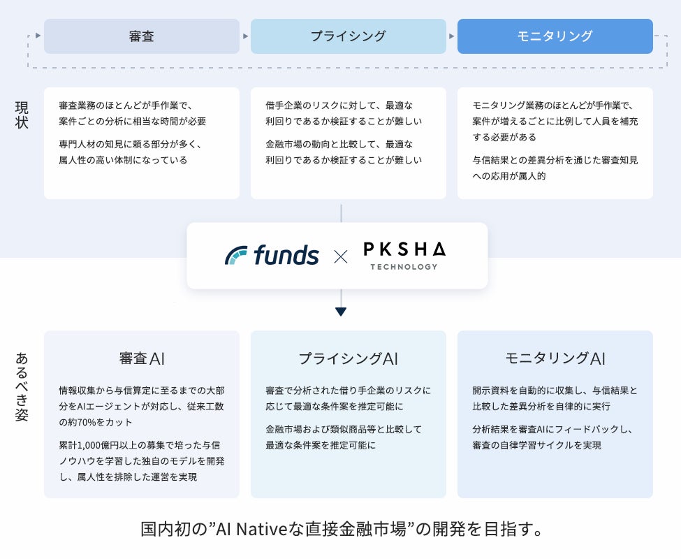 本提携は、伝統的でアナログな直接金融市場を、AI Nativeにフルデジタライズすることを目的としています。本取り組みは融資(デット)を中心とした領域を対象とし、Fundsが創業来蓄積してきたユニークデータと、PKSHAが持つ独自のアルゴリズム開発技術を掛け合わせ、与信審査・プライシング・モニタリングを中心とした業務の高度化を実現する AI エージェントを共同開発し、投資家に対してはより魅力的な投資機会を、借り手企業にはより円滑で事業特性に寄り添った資金調達機会を共同で開発・提供してまいります。